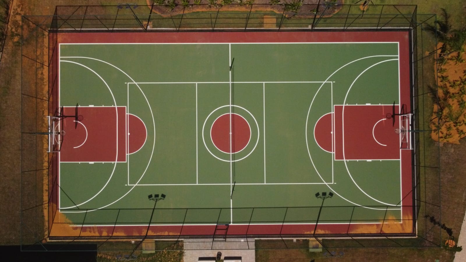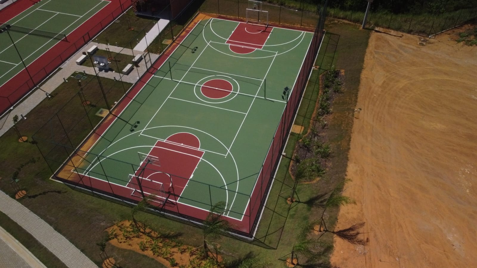Área Total: Campo de Grama: 232 m², Quadras de areia: 300m² (as duas), Quadra de Tenis: 550m², quadra de basquete: 70m³, Estrutura e Alambrado 700m²